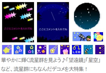 コンテンツ内容:華やかに輝く流星群を見よう♪「望遠鏡」「星空」など、流星群にちなんだデコメを大特集!