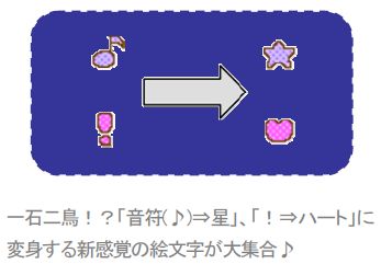 コンテンツ内容:一石二鳥!?「音符(♪)⇒星」、「!⇒ハート」に変身する新感覚の絵文字が大集合♪