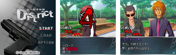 『仙人町市物語 ディストリクト1』は、治安の悪い仙人町市の港湾地区にはびこる人身売買組織「グスタフ」と、それを制圧する「潜在的犯罪者擁立組織対策班」から派遣された一人の少年が繰り広げるバイオレンスストーリーです。プレイヤーが動かす少年は銃を持っており、会話の途中で突然の銃撃戦に突入することもあります。銃の使用が遅れたりすることでライフゲージが減るため、緊張感溢れる展開をお楽しみいただけます。