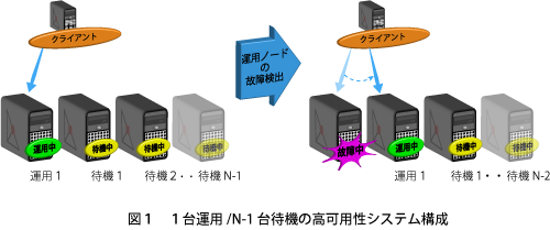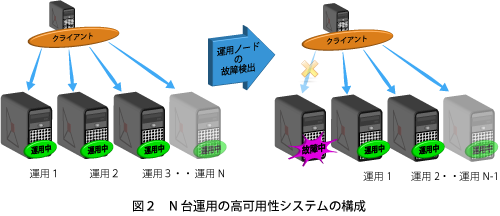 ・ 高可用性を実現するシステムの構成として、2ノード以上のN台のノード構成で1台運用/N-1台予備の構成や、N台運用の構成を実現。運用中のノードの増設、減設も可能です。
