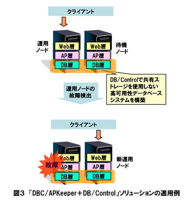 また、DBC/APKeeperを、当社開発の製品でPostgreSQLやMySQLの同期型レプリケータとして動作するDBMSクラスタリング・ソフトウェアDB/Control(ディービー・コントロール)と組み合わせたソリューション「DBC/APKeeper+DB/Control(ディービーシー・エーピーキーパー・プラス・ディービー・コントロール)」は、厳しいTCO削減と高可用性の両方が要求される3階層モデルのシステム実現のお役に立つソリューションです。具体的には、DB/Controlがノード間で高価な共有ストレージを使用せず高可用なデータベースシステムを構築し、DBC/APKeeperがDB/Controlの構築したDB層を含む3層(Web層、AP層、DB層)全体のシステムの高可用性を実現します(図3)。