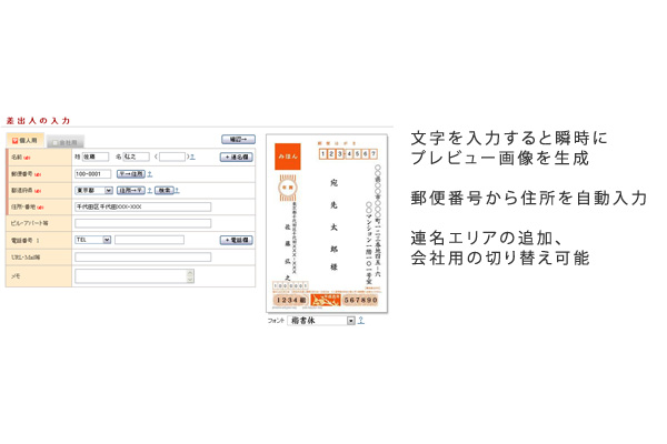 ポスコミは、文字を入力すると、すぐ横に印刷イメージを表示するため、年賀状ソフトと変わらない使い勝手を実現します。