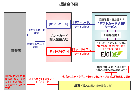 今回の提携により、凸版印刷と富士通FIPが提供している、「ギフトカードASPサービス」(※1)と、NTTカードソリューションが提供している、電子マネーギフトサービス「EJOICA(イージョイカ)」(※2)を連携させ、「ギフトカードASPサービス」を利用している企業向けに、ネット上で任意の金額のチャージを可能にする電子マネーギフト「ネット@ギフト」(ネットアットギフト)を開発、平成23年2月上旬より提供を開始します。