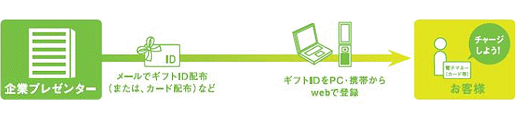 本サービスでは、企業が行うキャンペーンのインセンティブなどの用途で、「ギフトカードASPサービス」へ任意の金額をチャージできるID(ギフトID)を発行します。このIDは、メールやWebでの表示、シール、DMなどさまざまな形で、企業から消費者へプレゼントされます。消費者は、パソコンや携帯電話で専用の登録サイトにアクセスし、「ネット@ギフト」のギフトIDと、消費者が保有している「ギフトカード」のカード番号を登録。企業があらかじめ定めた金額を「ネット@ギフト」を通じて、消費者の持つ「ギフトカード」にチャージすることができます。企業は、各種キャンペーンやプロモーションのツールなどとしてギフトIDを配布、消費者の来店を促進し、顧客化へつなげることができます。