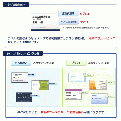 クラウンジュエルには運営するオークションサイトに関わる多様な取引先がおり、名刺をLKに登録することでこれらの顧客情報を整理し、共有していきます。また、ブランドや広告代理店など、名刺の属性別に「タグ」付けすることで顧客をカテゴライズし、名刺をより活用しやすい状態にしていきます。