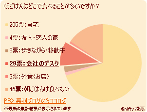 「朝ごはんはどこで食べることが多いですか?」という質問に対する回答を、ユーザーに6つの回答(「自宅」、「友人・恋人の家」、「歩きながら移動中」、「会社のデスク」、「外食(お店)」、「朝ごはんは食べない」)から選択してもらう