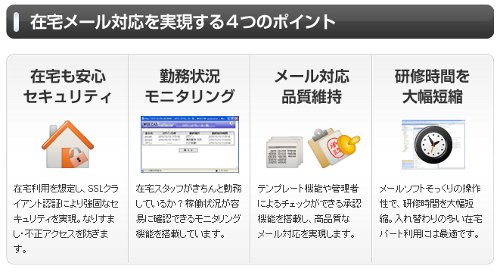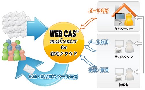 「WEB CAS mailcenter for在宅クラウド」(http://webcas.azia.jp/mailcenter/zaitaku/)は、在宅・社内スタッフどちらも、企業の顧客メール対応作業ができるメール共有管理システムです。企業のメール問い合わせ窓口や、問い合わせフォームに届くお客様からの問い合わせを一元管理することで、複数担当者による二重対応・対応漏れを防ぎ、テンプレートや承認機能により、スキルを問わず高品質な対応を実現します。