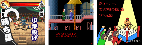 『大相撲九州場所』は、大相撲九州場所は、本番の立ち回りそのものの興奮が味わえるアクションゲームです。プレイヤーは力士となり、序の口から横綱までの10戦を勝ち抜いていきます。簡単操作で上手投げ、外無双、撞木反り等の大技を繰り広げることができ、巨体の力士を投げ飛ばすアクションは爽快感バツグンです。