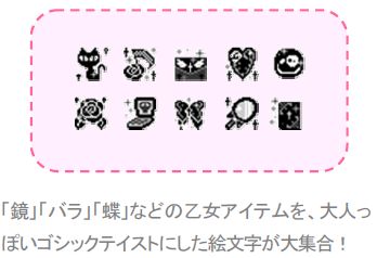 コンテンツ内容:「鏡」「バラ」「蝶」などの乙女アイテムを、大人っぽいゴシックテイストにした絵文字が大集合!