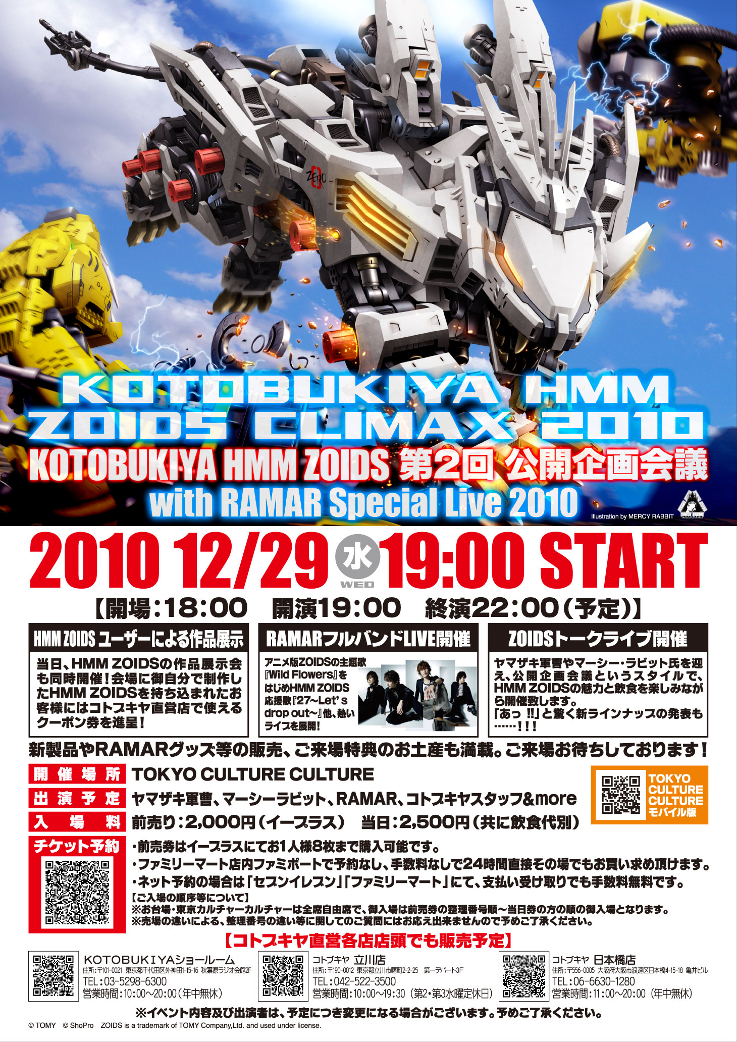 当日はプロモデラーのヤマザキ軍曹やイラストレーターのマーシー・ラビット氏を向かえ、コトブキヤスタッフと共にお客様との公開企画会議というスタイルで、HMM ZOIDSの魅力と飲食を楽しみながら開催致します。「あっ!!」と驚く新ラインナップの発表や、スペシャルアクトとしてお馴染み「RAMAR」によるフルバンドライブも予定。ファンが気になるあの企画の発表も…!?開催当日は、HMM ZOIDSの作品展示会も同時開催!会場に御自分で製作したHMM ZOIDSを持ち込まれたお客様にはコトブキヤ直営店で使えるクーポン券を進呈!また、新製品やRAMARグッズ等の販売やご来場特典のお土産も満載。第1回公開会議の新宿ロフトプラスワン開催を上回る内容で、皆様のお越しをお待ちしております!