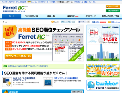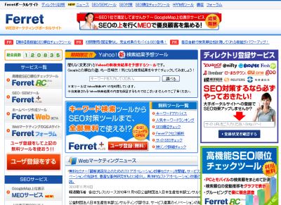 Ferretは、SEO・SEM対策に便利な無料ツールサイト『Ferret PLUS(フェレットプラス)』( http://tool.ferret-plus.com/ )や簡単無料ホームページ作成ツール『Ferret WEB(フェレットウェブ)』( http://web.ferret-plus.com/ )はじめとして、WEBサイト運営に役立つ情報やツールをワンストップで提供しております。
