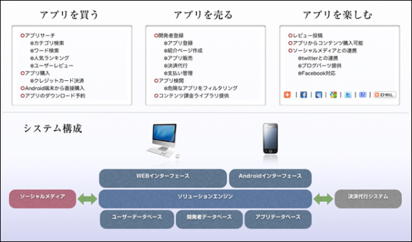 このシステムを利用することで短期間のアンドロイド用アプリケーションマーケットの構築が可能となり、構築後もソーシャルメディアとの連携機能により購入者及び開発者の双方のバイラルによるプロモーション効果を期待できるつくりとなっております。また、同システムがAPIで提供するコンテンツ課金に対応するためのSDKライブラリの配布も可能です。