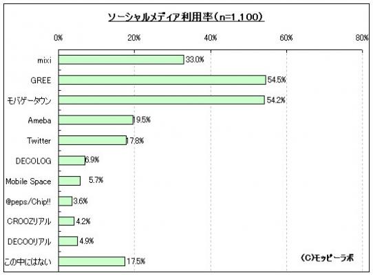 「利用しているモバイルソーシャルメディア」についてモバイルリサーチで聞いたところ、1位「GREE」(54.5%)、2位「モバゲー」(54.2%)、3位「mixi」(33.0%)という結果となり、会員数で差がないはずのmixiが上位2サイトに実利用で引き離される結果となった。次いで利用率の高かったサイトとしては「Ameba」(19.5%)、「Twitter」(17.8%)が並び、3大SNSを追いかける構図となった。ネットレイティングス社のPC調査ではmixiを抜いたTwitterが携帯でも利用者数を増やしているのがわかった。