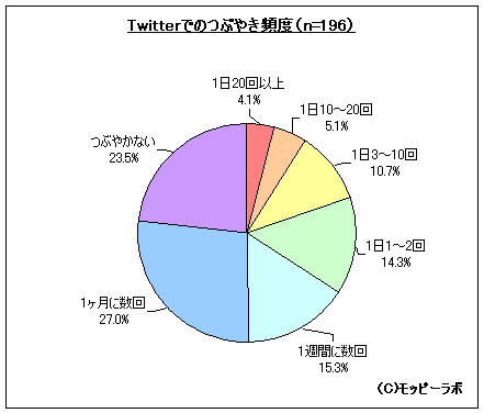 また、Twitter利用者に対して「つぶやく頻度」について聞いたところ、1日1回以上つぶやく人は34.2%、逆に「閲覧」のみでつぶやかない人は23.5%であった。携帯電話で閲覧・つぶやきをおこない、1日10回以上つぶやくユーザーも10%近くおり、Twitter依存症のユーザーが出現しそうな予感である。