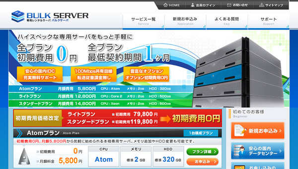 既に、個人・小規模サービス向け専用サーバプラン、「Atomプラン」においては初期費用0円にて提供しておりましたが、今回の価格改定により、『BULK SERVER』は全プラン初期費用0円、最低利用期間1ヶ月にて専用サーバがご利用いただけるようになりました。