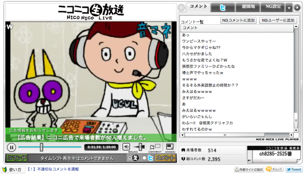 また、視聴者自身が番組を広告するというアイデアが出されました。実際に公開会議後に行われた本放送では、ニコニ広告を利用し、自腹で宣伝活動を行ってくれる視聴者が現れ、また、twitterやアメーバピグなどでの口コミなどもあり、広報活動は視聴者の協力によりの思わぬ方向へ発展しました。