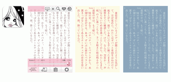 ◆背景と文字色の組み合わせ、スライダーアイコンのデザインを、ユーザー側でお選び頂けます(「こぼれそうな唇」と同様)。読むときの気分や、好みに合わせたカラーリングで、LiLyワールドを存分にお楽しみください。