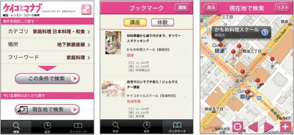 iPhoneアプリ「ケイコとマナブ 習い事さがし」は、約8万件の講座情報からスクールを検索できます。カテゴリ・場所の指定やフリーワードの入力ができるほか、現在地の近くにあるスクールを検索でき、資料請求や電話予約も可能となっています。