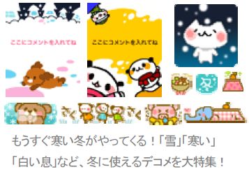 コンテンツ内容:もうすぐ寒い冬がやってくる!「雪」「寒い」「白い息」など、冬に使えるデコメを大特集!