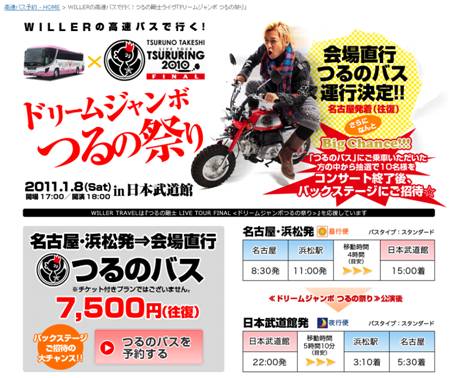 コンサートバスの第2弾としまして、2011年1月8日に開催されるつるの剛士の「ドリームジャンボつるの祭り」(http://travel.willer.co.jp/event/live/tsurunotakeshi/)において、会場までのコンサートバスとして「つるのバス」を販売します。今回は、ご利用者の中から抽選で10名をコンサート終了後にバックステージへご招待いたします。