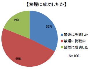禁煙挑戦者を対象に、「今回、禁煙に成功したか」を聞いたところ、約32%がすでに「失敗」と回答。1 ヶ月あまりで約1/3 が断念したことになります。