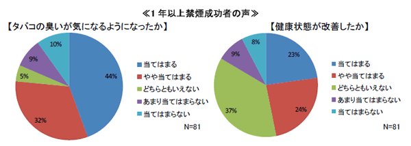 禁煙に成功すると、結果として変化はあるのでしょうか。「今まで1 年以上の禁煙に成功した人」を対象に「タバコの臭いがきになるようになったか」尋ねたところ、「当てはまる」、「やや当てはまる」を合わせて76%もの人が「気になるようになった」と回答。「健康状態が改善したか」という質問に対しては47%が「改善した(当てはまる、やや当てはまる計)」という結果となりました。