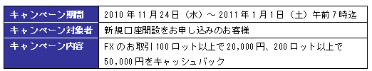 詳細はFXキャッシュバックキャンペーン(http://www.fxonline.co.jp/campaign/fx-cashback.html)