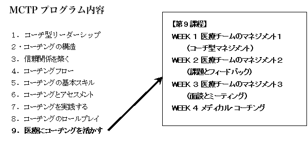 MCTPは、組織力向上、リーダーシップ開発など、一般企業ですでに成功しているコーチ・トゥエンティワンのメソッドを医療業界に特化したプログラムに構成し、医療現場におけるリーダーシップ開発の実現を目指す国内初の実践的なコーチング・プログラム。当社のリーダーシップ開発プログラム、「コーポレート・コーチ・トレーニング・プログラム(CCTP)」の8課程と、医療従事者専用モジュール(M09)で構成されています。このM09は、医療チームをマネジメントする際に必要とされるマネジャーとしてのマインド、医療現場でコーチングが有効な場面とそこで活用できるスキルの紹介、また、多くのエクササイズなどで構成されています。コーチ資格を有する現職医師のチームが、医療従事者専用モジュールのマニュアルの執筆からクラスの運営までを手掛けているため、現場の実態とニーズに即したプログラムになっています。価格は280,000円(税抜き)、履修有効期間は10ヶ月。