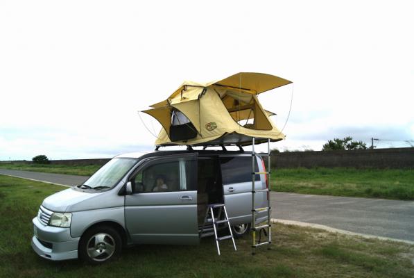 ・ルーフテント自体は2人用ですがミニバンに搭載すれば上に2人、車内