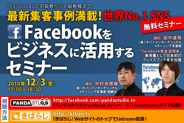 株式会社キバンインターナショナル(東京都千代田区・代表取締役 西村正宏)は、12/3(金)17時より、『最新集客事例満載!~世界No.1 SNS Facebookをビジネスに活用するセミナー~』を無料で開催致します。