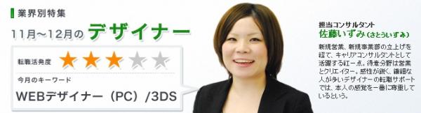 WEB業界全体の活性化に伴い、デザイナー職の求人も確実に回復傾向にあります。来年2月発売の「ニンテンドー3DS」は本体価格が比較的高価であるため爆発的ヒットに繋がるかどうかは未知数ですが、リアルタッチのデザインや3Dデザインのニーズ回復に結びつくことが期待されます。