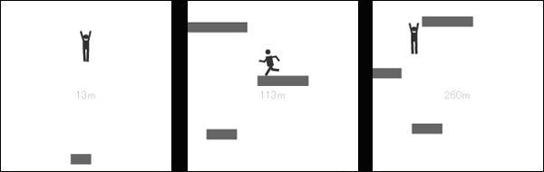 『オチールforGREE』は、人型キャラクターを左右に動かし、画面下から上にスクロールする大小様々なブロックの上を、踏み外さないように次々と跳び移り落下していくアクションゲームです。キャラクターがブロックを踏み外したり、跳ぶタイミングを逃して画面外に出てしまうことで、ゲームオーバーとなります。