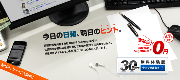 株式会社サンロフト(静岡県焼津市、代表取締役社長:松田敏孝)は、業務日報をベースにコミュニケーションの活性化をはかる社内SNS「nanoty BP(ナノティ・ビー・ピー)」(以下、nanoty BP)のサービスを改良し、初期費用および月額費用も改定しました。そして、2010年11月29日~2011年2月28日までは初期費用(98,000円)を無料にするキャンペーンを実施することになりました。