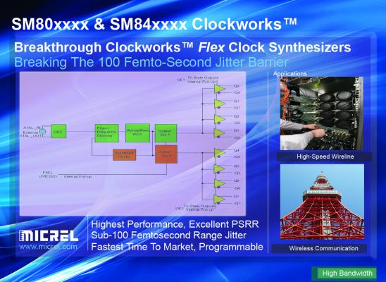 米アナログ、高帯域通信、イーサネットICソリューションの業界のリーダーである米国マイクレル・セミコンダクタ社の日本法人マイクレル・セミコンダクタ・ジャパン株式会社(以下:マイクレル社、横浜市西区みなとみらい 代表取締役社長:山本一博)は、本日、次世代高性能プログラマブル クロックシンセサイザ、Micrel ClockWorks™ Flexファミリの最初の製品であるSM802xxxを発表した。