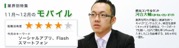 他方、モバイルプランナー・ディレクター職は復調し、ソーシャル分野やスマートフォン向けの求人のみならずフィーチャー・フォン(日本で普及している多機能携帯電話)向けコンテンツ担当者の求人も目立ちました。