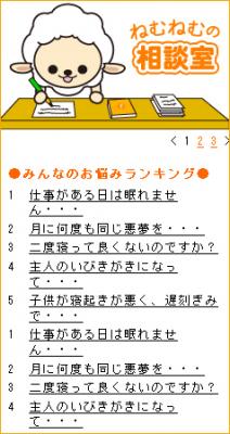 本サービス『ねむねむの相談室』は、ユーザーからの眠りに関するお悩みに対して、弊社睡眠改善インストラクターが専門医の監修のもと、お答えする、というものです。