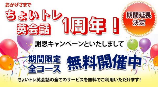 『ちょいトレ英会話』は皆さまのご愛顧に支えられ、おかげさまで“一周年”を迎えることができました。皆様への感謝の気持ちを込めて、『ちょいトレ英会話では』「ちょいトレ英会話一周年謝恩キャンペーン」を開催しておりました。