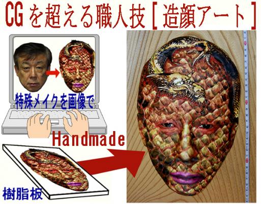 映画や舞台イベントなどで行われる特殊メイクを画像編集で行い、これを独特の手法で立体像に仕上げる、