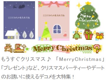 コンテンツ内容:もうすぐクリスマス♪ 「MerryChristmas」「プレゼント」など、クリスマスパーティーやデートのお誘いに使えるデコメを大特集!