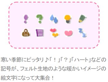 コンテンツ内容:寒い季節にピッタリ♪「!」「?」「ハート」などの記号が、フェルト生地のような暖かいイメージの絵文字になって大集合!