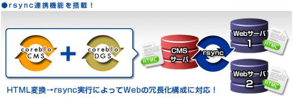 「coreblo-DGS」に新たにrsync実行機能を追加いたしました。coreblo-CMSサーバーをアプリケーションサーバーおよびステージン グサーバーとして機能させ、coreblo-CMSサーバー上に出力されたWebコンテンツを、複数台の公開用Webサーバーと同期させる事が可能です。