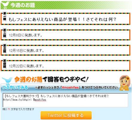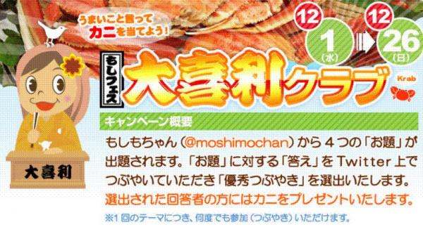株式会社もしも(本社:東京都渋谷区、代表取締役社長:実藤裕史、以下:もしも)は、フラッシュマーケティングサイト『もしフェス』において、年末イベントとして期間限定の「大喜利クラブ」を開催します。「お題」に対するユニークな「答え」をツイッターで募集し「優秀つぶやき」には年末グルメの「カニ」をプレゼントいたします。(開催期間:2010年12月1日~2010年12月26日)