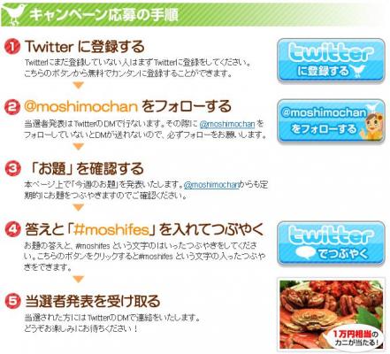 もしもちゃんからの「お題」と、「優秀つぶやき」の発表は毎週水曜日に行い、期間中に合計3名の方に「カニ」がプレゼントされる予定です。