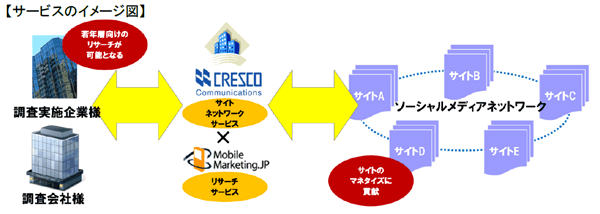 株式会社モバイルマーケティング.・ジャパン(本社:東京都港区、代表取締役社長:江尻 尚平)は、株式会社クレスコ・コミュニケーションズ(本社:東京都品川区、代表取締役社長:稲垣 昭治)と共同で、複数のパソコンサイトおよび携帯サイトをネットワーク化し、各サイト会員の「属性」を明らかにした上で、企業様に対して「調査実施」と「調査パネル」提供を行う、「ソーシャルメディア・リサーチサービス」を、2010年12月10日より開始致します。