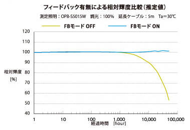 LED照明にセンサを内蔵しており、同時発売となるLED照明コントローラ Advanced “OPPFシリーズ”と接続することで業界初となる電力線通信による輝度のモニタリングとフィードバック制御を実現しました。この新機能「FALUX sensing」の搭載により、モニタ値の変動に対して電圧を可変して、初期の輝度を維持します。よって約4万時間でも当初の輝度を維持することができ、長期の安定性を得ることができます。