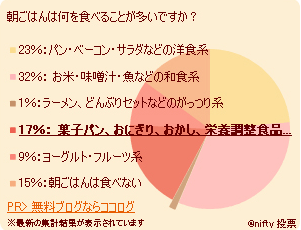 「朝ごはんは何を食べることが多いですか?」という質問に対する回答を、ユーザーに6つの回答(「パン・ベーコン・サラダなどの洋食系」、「お米・味噌汁・魚などの和食系」、「ラーメン、どんぶりセットなどのがっつり系」、「菓子パン、おにぎり、おかし、栄養調整食品系」、「ヨーグルト・フルーツ系」、「朝ごはんは食べない」)から選択してもらう
