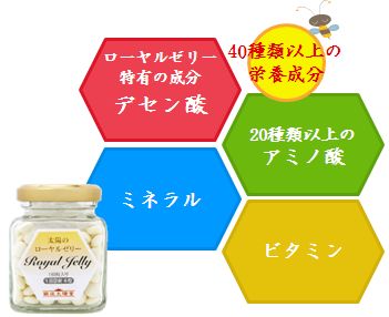 「太陽のローヤルゼリー」には、ローヤルゼリー特有の成分である「デセン酸」、アミノ酸、ミネラル、ビタミンなど40種類以上の豊富な栄養素が含まれています。