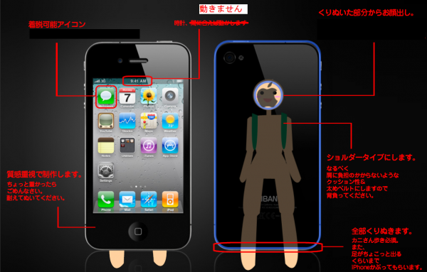 この着ぐるみは、iPhone4の販売の際にはTVでも取り上げられ、以降も展示会(eLearning WORLD 2.0)、友人の結婚式二次会 などで活躍しており、この度、「折角なのでより多くの人々に楽しんでもらおう」と無料貸し出しを決定致しました。以下の概要・注意事項をよくお読みいだきまして、お申し込み下さい。