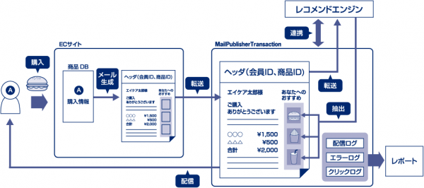 MailPublisher Transactionは、レシートメールなどのトランザクショナルメールに、ユーザーの購買履歴、行動履歴などを解析し生成されたレコメンド情報を自動で差し込むことで、クロスセルを促す、国内初のマーケティングソリューションです。今回、同システムにコンバージョン測定機能が新たに追加されたことで、トランザクショナルメールからの最終的な成果をレポートすることが可能になり、効果検証の精度が高まります。