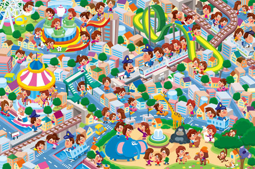 個々のかわいいキャラクターの「陽」のパワーも見事ですが、それらが、村や島、惑星など、ひとつのスペースに群集する「密度」のパワーも、眩しいまでの魅力を放っています。静止画だけではなく、インタラクティブなアニメーションやウェブへの展開も注目されています。